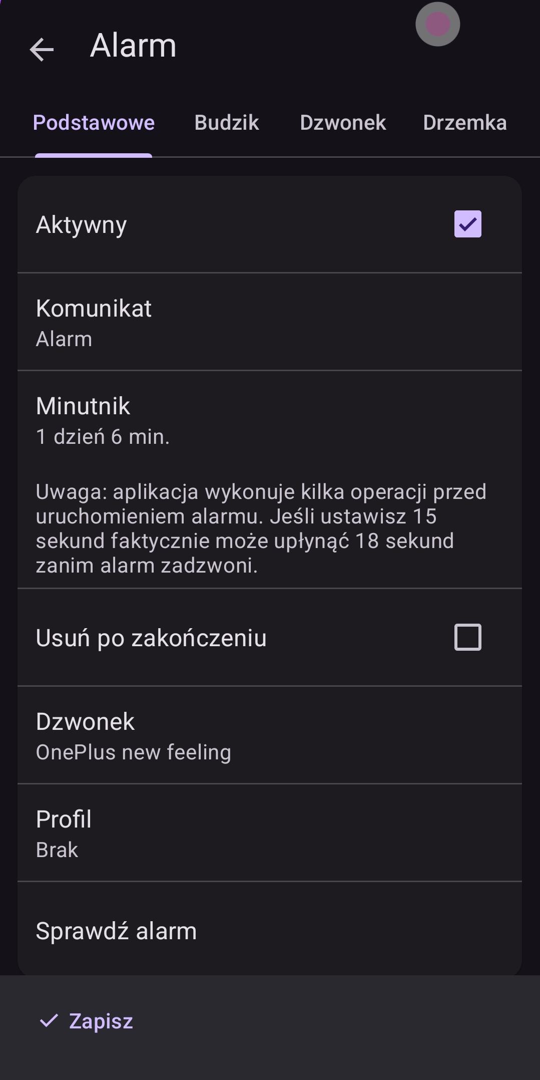 After saving the alarm, it is set for tomorrow in 1 day + 6 minutes.